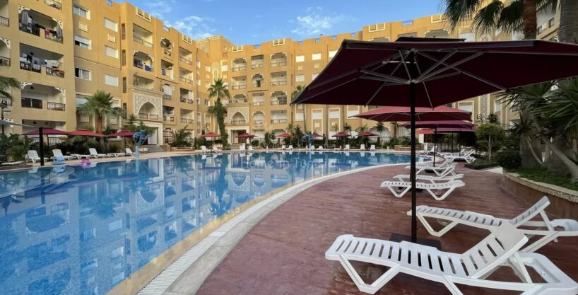 location saisonnière, studio (S+1), situé dans la résidence « Folla Chatt Meriem », offrant un emplacement privilégié les pieds dans l’eau. La résidence propose un ensemble impressionnant de commodités pour un séjour confortable et agréable.